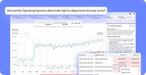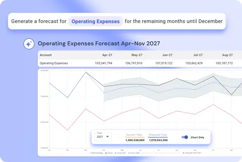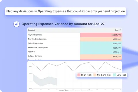 AI financial planning uses machine learning and natural language interfaces to generate forecasts, identify trends, and explain financial outcomes. Instead of manually building models, teams can use AI to analyze historical data, surface insights, and produce projections that continuously update as inputs change.