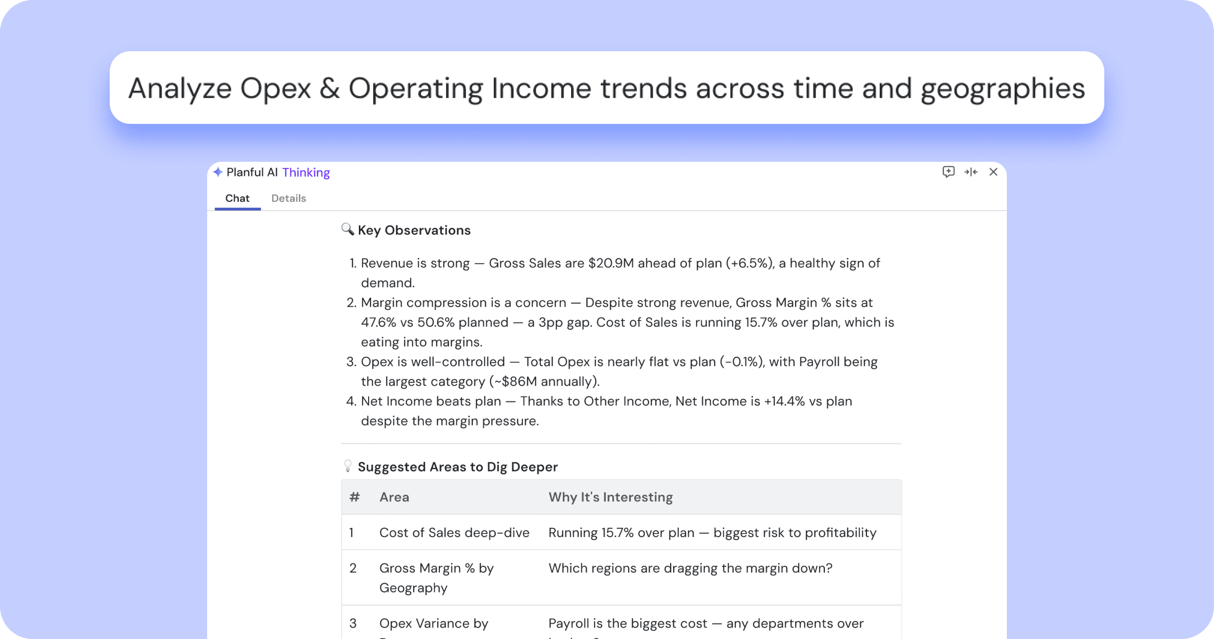 Planful AI is purpose-built for financial planning and works directly on structured financial data within your environment. Unlike general AI tools, it combines forecasting, anomaly detection, and explainable insights in one workflow, helping finance teams plan, analyze, and act without switching between systems.