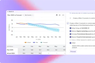 Analyst enables real-time what-if modeling, scenario adjustments, and reforecasting. When anomalies or trends emerge, it not only highlights them—it recommends levers to improve performance while keeping you in control. With seamless options to save, share, and act on results in Planful, you can pivot quickly with precision and governance intact.