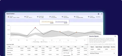Turn anomalies into insight. Signals shows how your results compare to historical actuals and predicted ranges, helping you validate data quality, explain the story behind variances, and deliver reports with confidence.