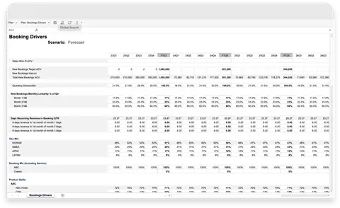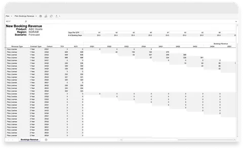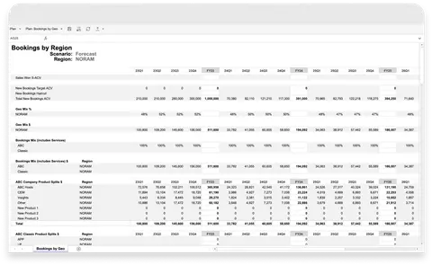 Get a holistic view of bookings and revenue recognition that starts with revenue drivers and key assumptions allocated across regions and product lines and sets targets based on revenue goals and that can be adjusted for seasonality.