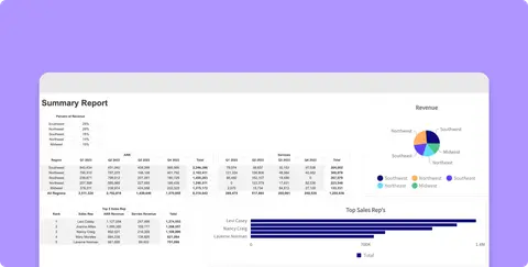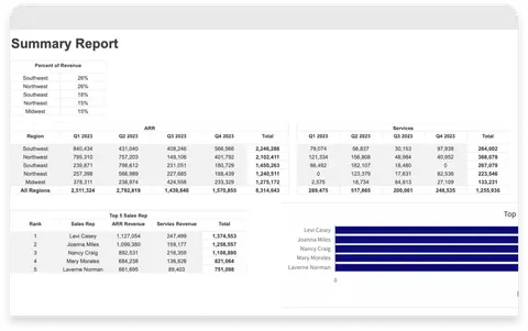 View consolidated compensation trends and then focus on seller types to see the percentage of revenue, regions to see recurring revenue by type, and categories to highlight the best-performing sellers.