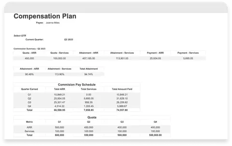 Integrate CRM data to apply compensation assumptions, set individual quotas, and adjust on-target variables, and then factor in individual seller performance to determine achievement-based compensation by period that includes spiffs and one-time bonuses.